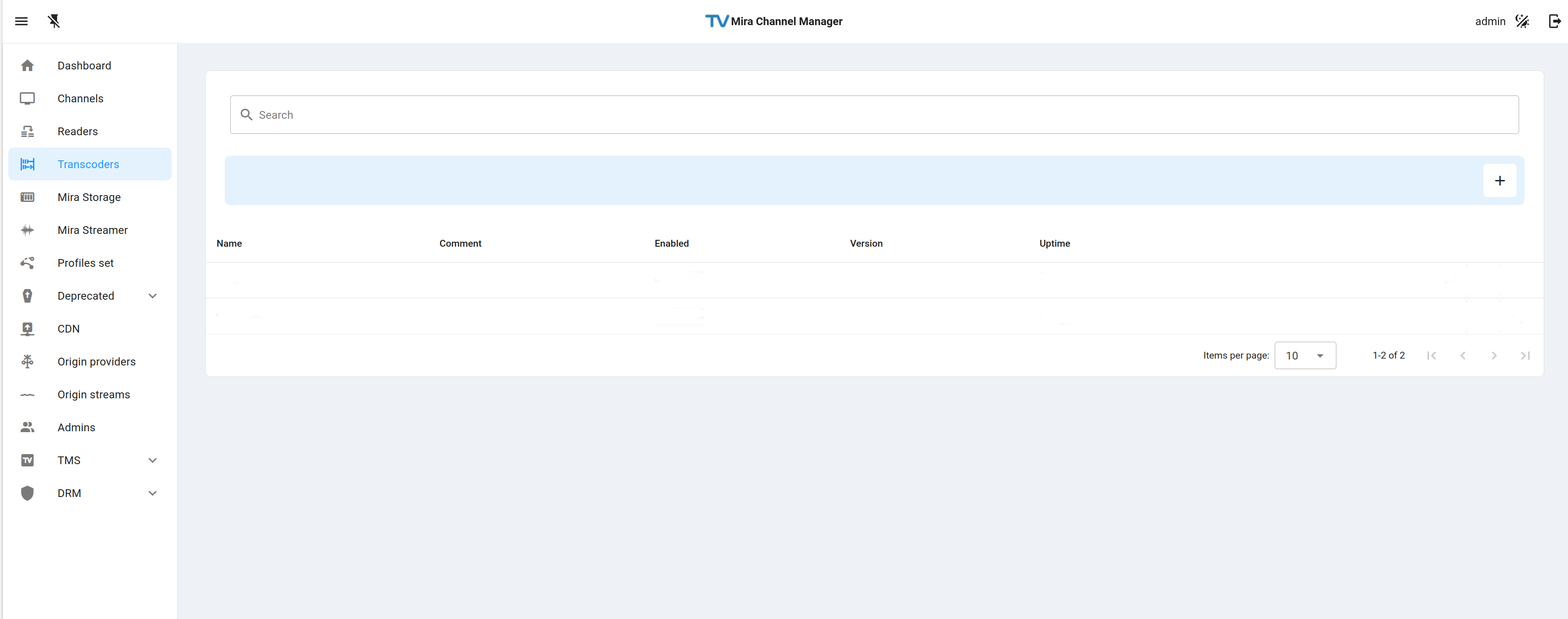 Для добавления транскодера в веб-интерфейс Mira Channel Manager, перейдите на вкладку Transcoders в появшемся окне нажмине кнопку Плюс: