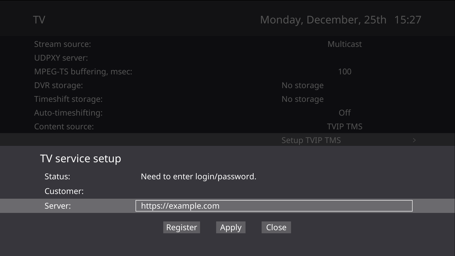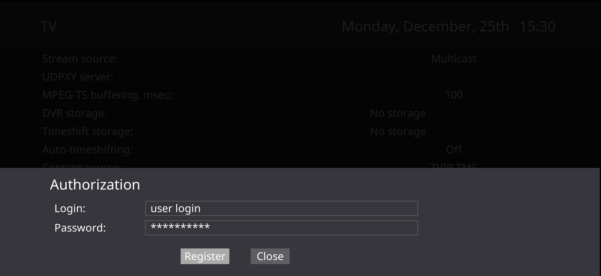 При использовании этого варианта настройки медиацентр получает с сервера. При подключении нужно будет только ввести логин и пароль.